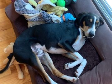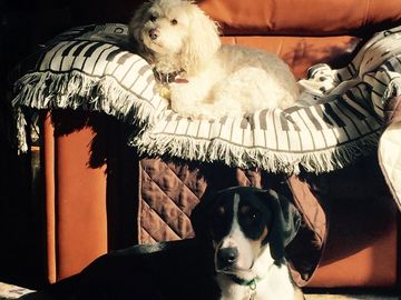 Our dog daycare and dog boarding visitors stay in Jack’s Livingroom. Our 7-year-old rescue hound dog, Jack, is the host. In Jack’s Livingroom, dogs lounge on sofas and chairs, romp together inside on a cushioned floor on rainy days, watch TV, and listen to music. A specially-selected sleeping music track is played during evening hours, and folk-pop music is played during the day.